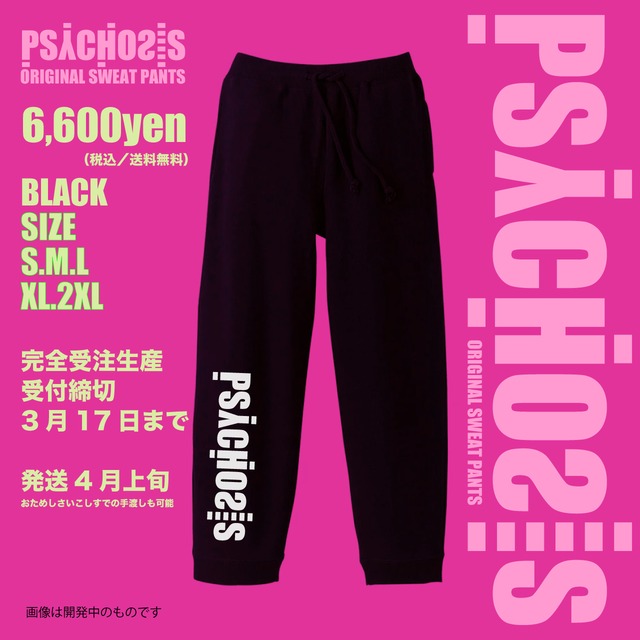 PSYCHOSIS REHEARSAL SWEAT PANTS 2026 ECサイト限定の完全受注生産。 PSYCHOSISのオリジナルスウェットパンツです。 リハーサルやレッスン、普段着としても使いやすいシンプルなシルエット。 パイル地なので軽くて履き心地がよく、ガンガン洗えるタフな仕様です。 稽古場でも、街でも。 PSYCHOSISのロゴをさりげなく楽しめる一本。 ※PSYCHOSISキャストのリハーサルウェアとしても使用予定のモデルです。 価格 6,600円(税込)※送料無料 カラー BLACK サイズ S / M / L / XL / 2XL 受注受付:3月17日23:59まで この期間の申し込み数のみで生産される完全受注アイテムです。 再販予定なし 発送予定:4月上旬 ※※※※※4/8・4/9開催のPSYCHOSISのワークショップ「おためしさいこしす」参加者の方は会場での手渡し受取も選択できます。 「おためしさいこしす」に関してはこちらをご覧ください。 https://www.psychosis13.com/